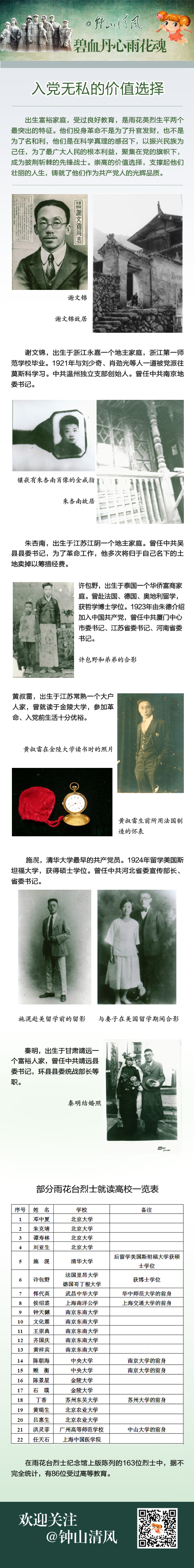 出生富裕家庭,受过良好教育,是雨花英烈生平两个最突出的特征。他们投身革命不是为了升官发财,也不是为了名和利,他们是在科学真理的感召下,以振兴民族为己任,为了最广大人民的根本利益,聚集在党的旗帜下,成为披荆斩棘的先锋战士。崇高的价值选择,支撑起他们壮丽的人生,铸就了他们作为共产党人的光辉品质。