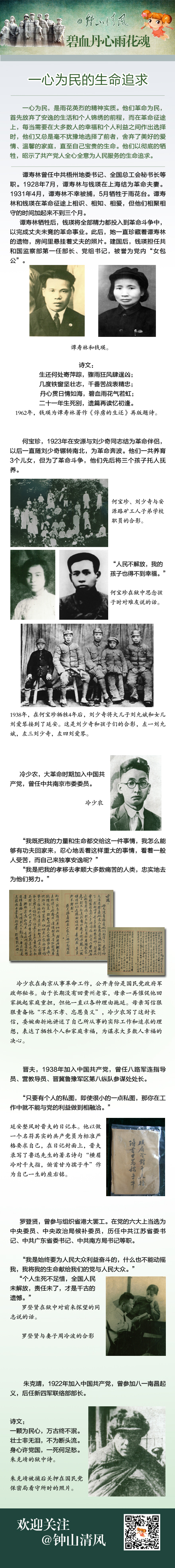 一心为民,是雨花英烈的精神实质。他们革命为民,首先放弃了安逸的生活和个人锦绣的前程,而在革命征途上,每当需要在大多数人的幸福和个人利益之间作出选择时,他们又总是毫不犹豫地选择了前者,舍弃了美好的爱情、温馨的家庭,直至自己宝贵的生命。他们以彻底的牺牲,昭示了共产党人全心全意为人民服务的生命追求。