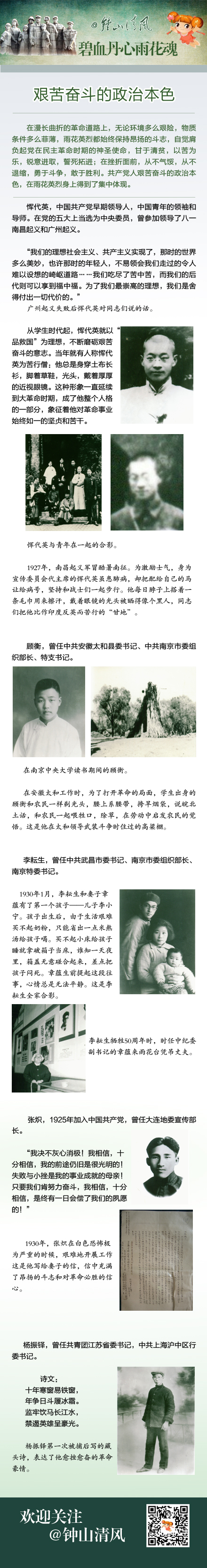 在漫长曲折的革命道路上,无论环境多么艰险,物质条件多么菲薄,雨花英烈都始终保持昂扬的斗志,自觉肩负起党在民主革命时期的神圣使命,甘于清贫,以苦为乐,锐意进取,誓死拓进;在挫折面前,从不气馁,从不退缩,勇于斗争,敢于胜利。共产党人艰苦奋斗的政治本色,在雨花英烈身上得到了集中体现。