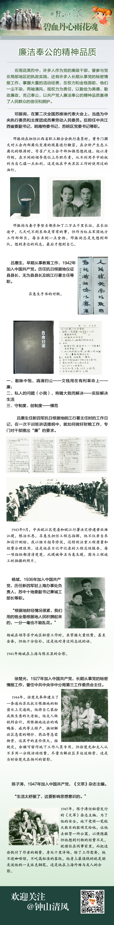 在雨花英烈中,许多人作为党的高级干部,曾参与党在局部地区的执政实践,还有许多人长期从事党的秘密情报工作,掌握大量的活动经费,在权力和金钱面前,他们一尘不染,两袖清风,视权力为责任,以勤俭为美德,勤政廉政,克己奉公,以共产党人廉洁奉公的精神品质赢得了人民群众的信任和拥护。