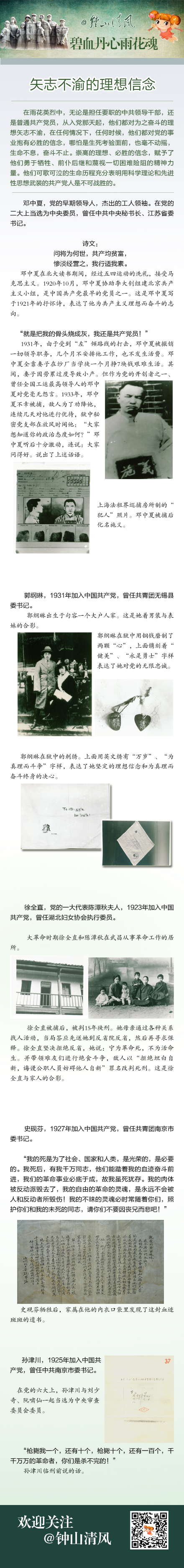 在雨花英烈中,无论是担任要职的中共领导干部,还是普通共产党员,从入党那天起,他们都对为之奋斗的理想矢志不渝,在任何情况下,任何时候,他们都对党的事业抱有必胜的信念,哪怕是生死考验面前,也毫不动摇,生命不息,奋斗不止。崇高的理想、必胜的信念,赋予了他们勇于牺牲、前仆后继和蔑视一切困难险阻的精神力量。他们可歌可泣的生命历程充分表明用科学理论和先进性思想武装的共产党人是不可战胜的。