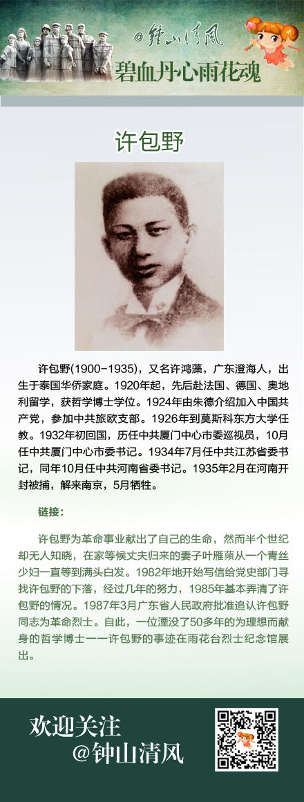 许包野(1900-1935),又名许鸿藻,广东澄海人,出生于泰国华侨家庭。1920年起,先后赴法国、德国、奥地利留学,获哲学博士学位。1924年由朱德介绍加入中国共产党,参加中共旅欧支部。1926年到莫斯科东方大学任教。1932年初回国,历任中共厦门中心市委巡视员,10月任中共厦门中心市委书记。1934年7月任中共江苏省委书记,同年10月任中共河南省委书记。1935年2月在河南开封被捕,解来南京,5月牺牲。