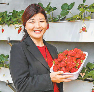 吕妙霞在展示刚刚采摘的草莓。新华社记者 李 博摄