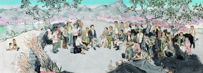 四川省宜宾市筠连县腾达镇春风村党支部书记王家元为了此次展览连夜赶到北京,看到作品中的自己,他有些不好意思。“未来我们要发展乡村生态旅游,让山更绿,水更清,村更美,人更和谐。”王家元带领春风村干部群众,迎难而上、创新巧干,开凿出山公路,发展特色产业,把石漠化严重、自然条件恶劣的“石山村”,变成了花果飘香的“世外桃源”,发展成全省富裕文明的新农村,创造了脱贫致富的独特发展模式。作品《春风村的领路人——王家元》中,这位带领大家致富的“带头人”与村民围坐在一起,周围群山环抱、繁花盛开,呈现出春风吹拂下的勃勃生机。来自中央美术学院的刘庆和教授说,王家元在基层工作的实干担当和身上充满的正能量深深打动了他,刻画这样的人物,他的笔墨间充满着感情。