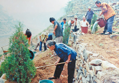 靳月英(中)带着家人和造林队在绿化荒山。资料照片