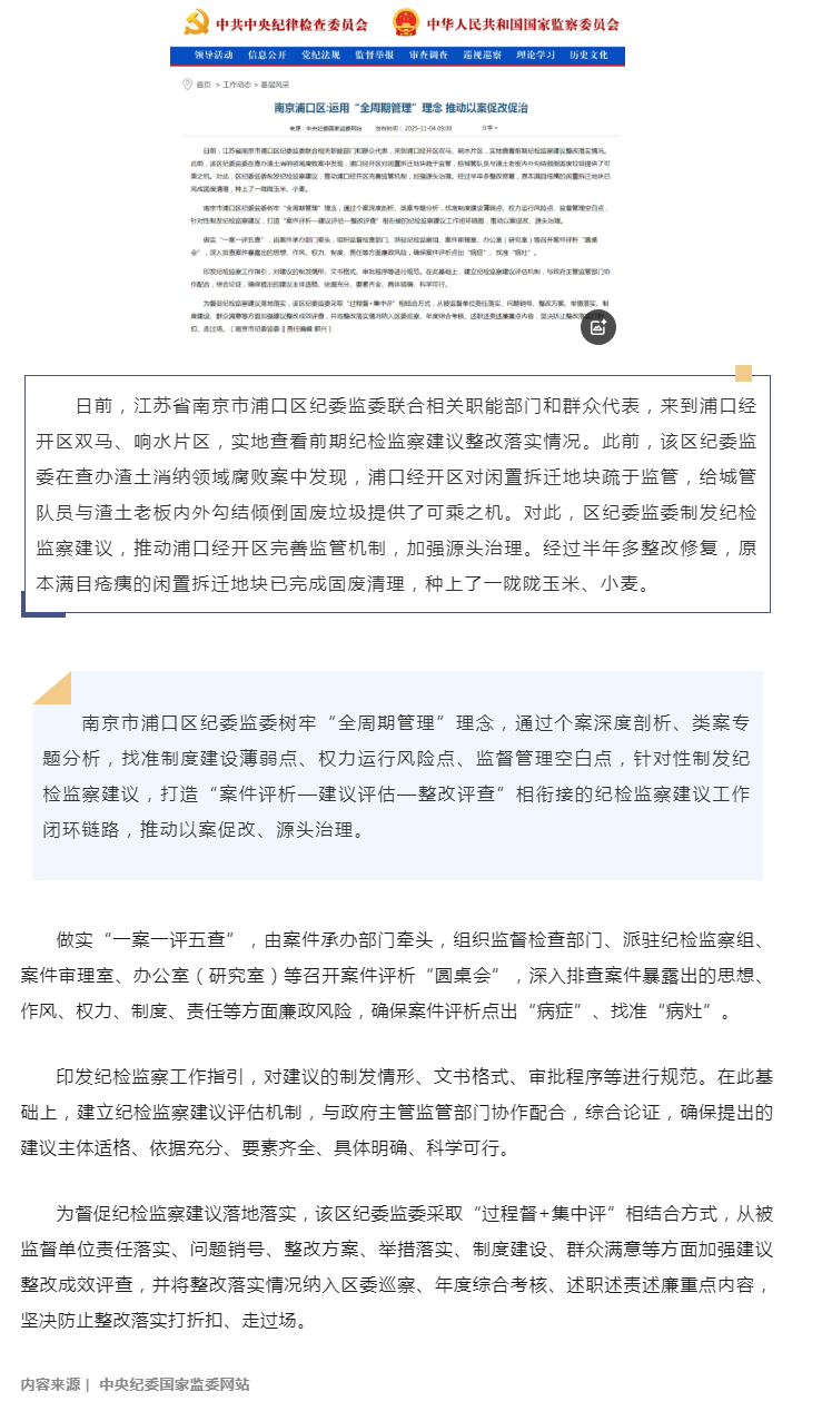 中央纪委国家监委网站刊稿:南京浦口区运用“全周期管理”理念 推动以案促改促治