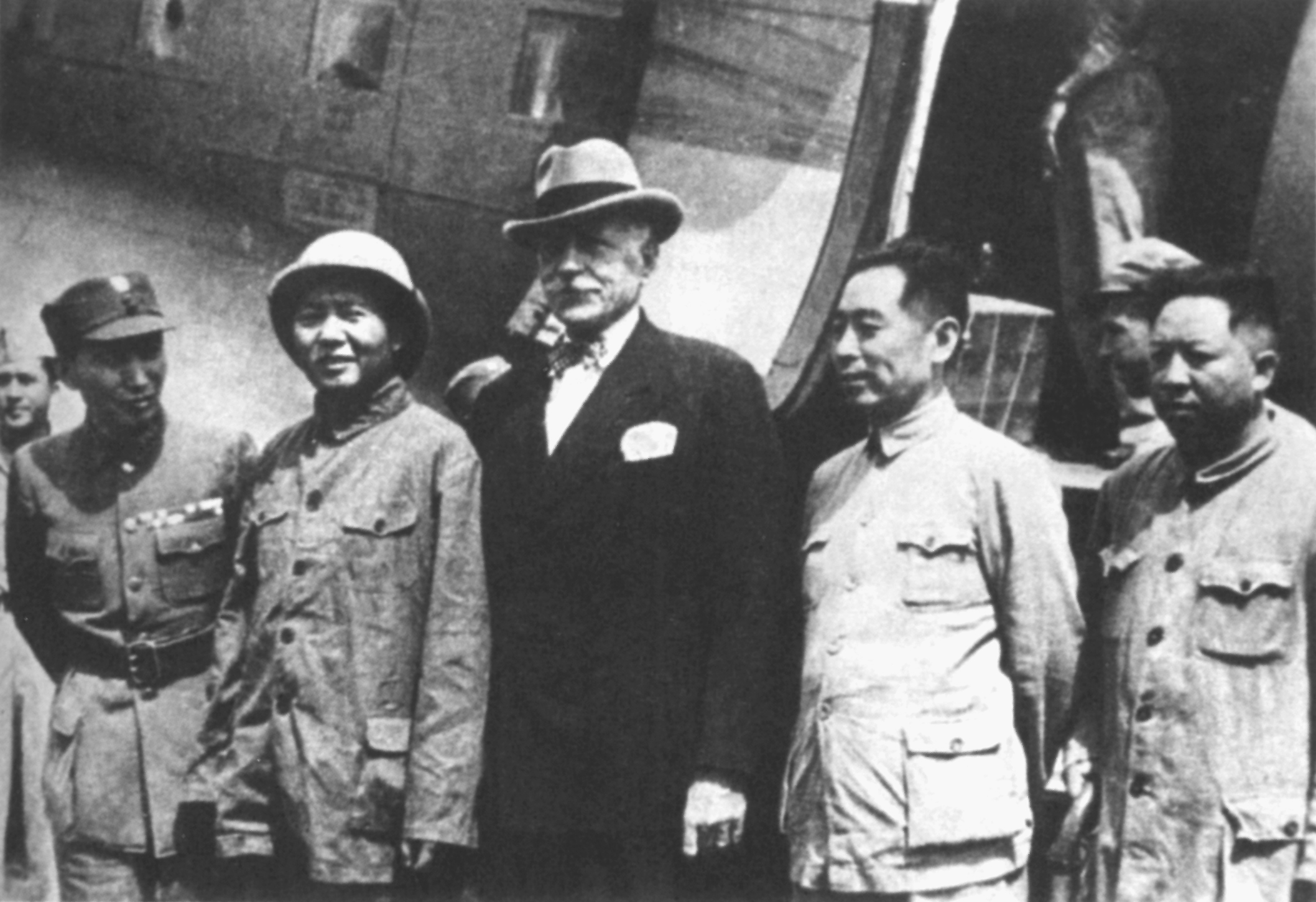 抗日战争胜利后,为谋求国内和平民主,1945年8月28日,毛泽东、周恩来、王若飞在美国驻华大使帕特里克·杰伊·赫尔利、国民党政府代表张治中陪同下,赴重庆同国民党政府进行和平谈判。图为毛泽东、周恩来、王若飞(右一)赴重庆谈判时,与张治中(左一)、赫尔利(右三)在延安机场合影。