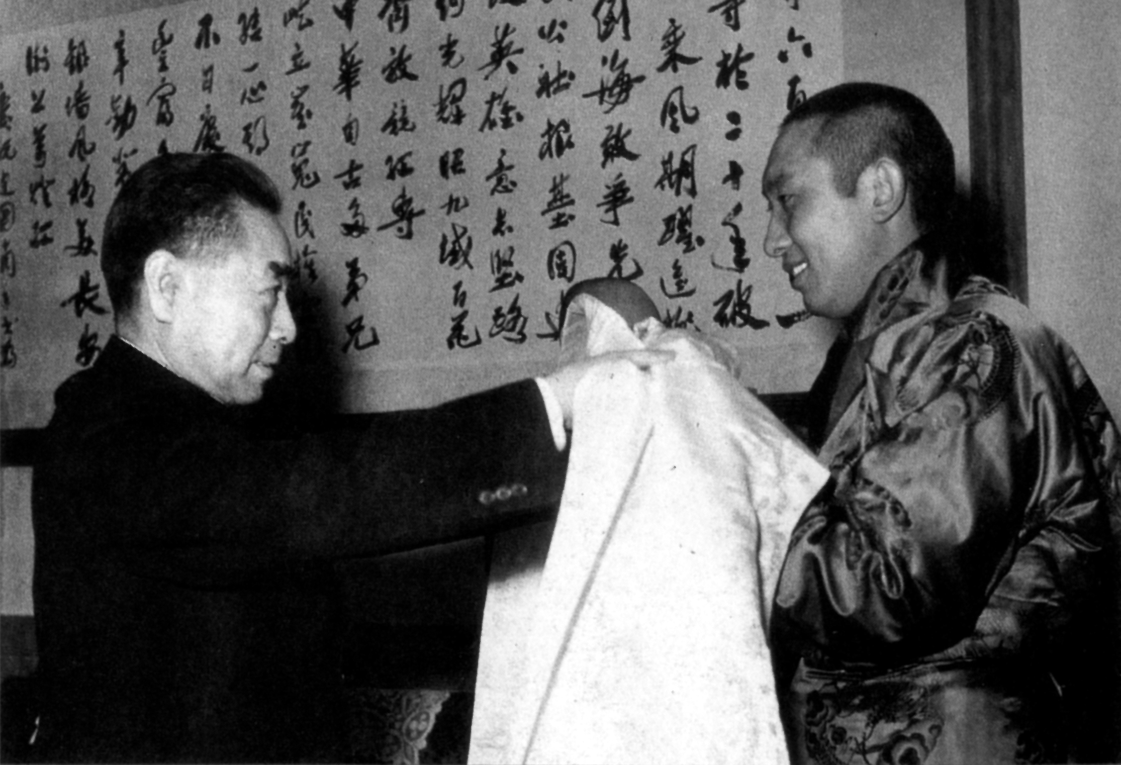 月,周恩来会见班禅额尔德尼·确吉坚赞时,接受他献的表达藏族人民敬意的哈达。
