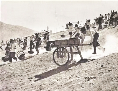 建设十三陵水库时热火朝天的劳动场面。