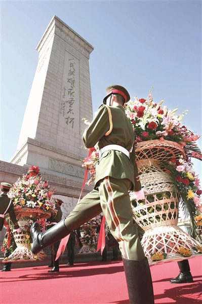 在天安门广场人民英雄纪念碑前举行的向人民英雄敬献花篮仪式。(资料图片)