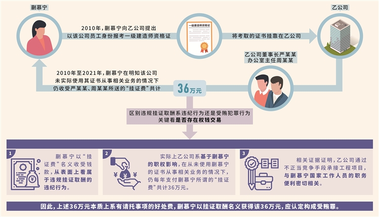 经查,2010年,蒯慕宁主动向其管理和服务对象乙公司提出以该公司员工身份报考一级建造师资格证,并提交了虚假报考材料。蒯慕宁在获得一级建造师资格证后,长期挂靠在该公司以获取报酬。实践中,区别违规挂证取酬系违纪行为还是受贿犯罪行为,关键看国家工作人员是否利用本人职务上的便利,为他人谋取利益,即是否存在权钱交易。蒯慕宁以“挂证费”的名义收受钱款,从表面上看属于违规挂证取酬的违纪行为,但实际上乙公司系基于蒯慕宁的职权影响,在从未使用蒯慕宁的一级建造师资格证书从事相关业务的情况下,仍每年支付蒯慕宁所谓“挂证费”共计36万元。相关证据证明,乙公司通过不正当竞争手段承接工程项目谋取的巨额利益,与蒯慕宁国家工作人员的职务便利密切相关。因此,上述36万元本质上系有请托事项的好处费,蒯慕宁以挂证取酬名义收受该36万元,应认定构成受贿罪。