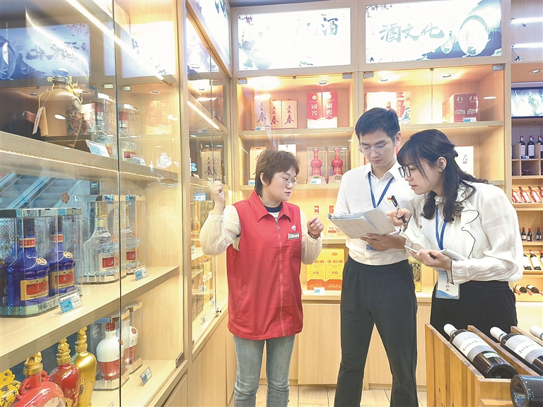 江苏省淮安市清江浦区纪委监委深入烟酒超市、饭店宾馆等场所,排查违规吃喝、违规收送礼品礼金购物卡券等问题线索,深挖细查风腐交织问题。图为近日,该区纪委监委工作人员在辖区商超调查走访。岳子莹 摄