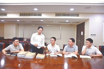 图为秦淮区纪委监委案件审理室和第六审查调查室工作人员围绕杨杰案有关问题进行研讨。 蒋守昌 摄