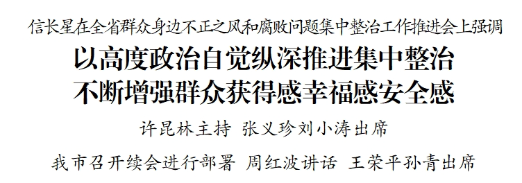 信长星强调,要坚持集中攻坚,聚焦群众反映强烈的突出问题,围绕中央及省里明确的专项整治项目,敢于动真碰硬,一个项目一个项目整治,一个领域一个领域推进,让群众真切感受到正风肃纪反腐就在身边、公平正义就在身边。要坚持有案必查,依规依纪依法深挖不正之风背后的腐败问题、细查滋生腐败的作风问题,持续释放一严到底、寸步不让的强烈信号,始终做到利剑高悬、震慑常在。要坚持标本兼治,把“当下改”和“长久立”结合起来,通过查处一类案件推动健全一套制度、治理一个领域,完善基层监督体系,推动各类监督贯通协调,进一步建强基层党组织,更好维护群众切身利益。要坚持党的领导,各级党委政府要扛好集中整治主体责任,各级党委书记要履行好“第一责任人”责任,各级纪委监委要加强统筹调度和督促指导,各有关部门要全面排查整治本行业、本系统侵害群众利益问题,上下协同、条块结合,共同把这项民心工作抓实抓好抓到位,不断增强群众的获得感、幸福感、安全感,努力交出一份实实在在、让群众满意的成绩单。