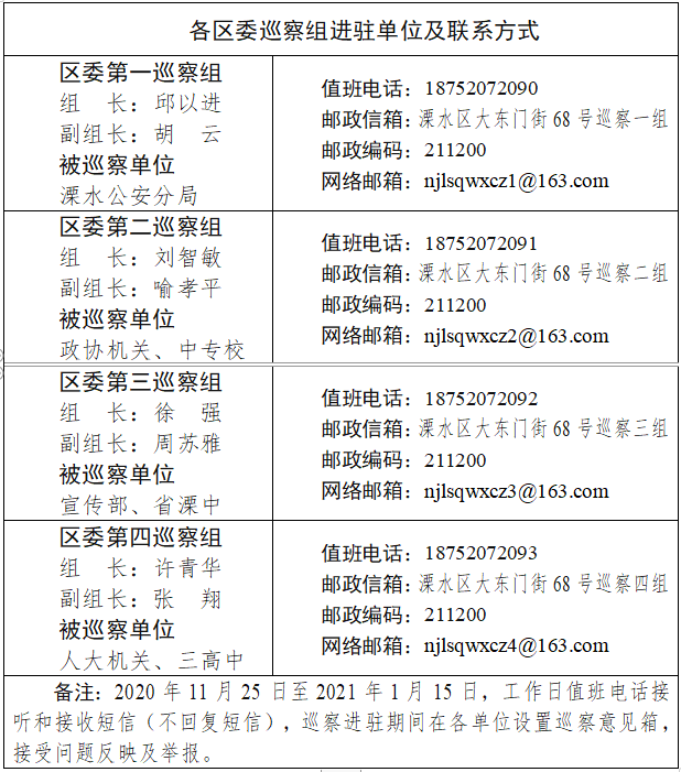 本轮巡察,4个区委巡察组将在被巡察部门、学校工作一个半月左右。巡察期间专门设值班电话、邮政信箱。根据巡视工作条例规定,区委巡察组主要受理反映被巡察部门、学校党组织领导班子及其成员、区委管理的其他干部以及下一级主要负责人(含已离休、已调离)、中层以下党员干部违纪问题的来信来电来访,重点是关于违反政治纪律、组织纪律、廉洁纪律、群众纪律、工作纪律和生活纪律等方面的举报和反映。巡察组受理信访时间截止到2021年1月15日。