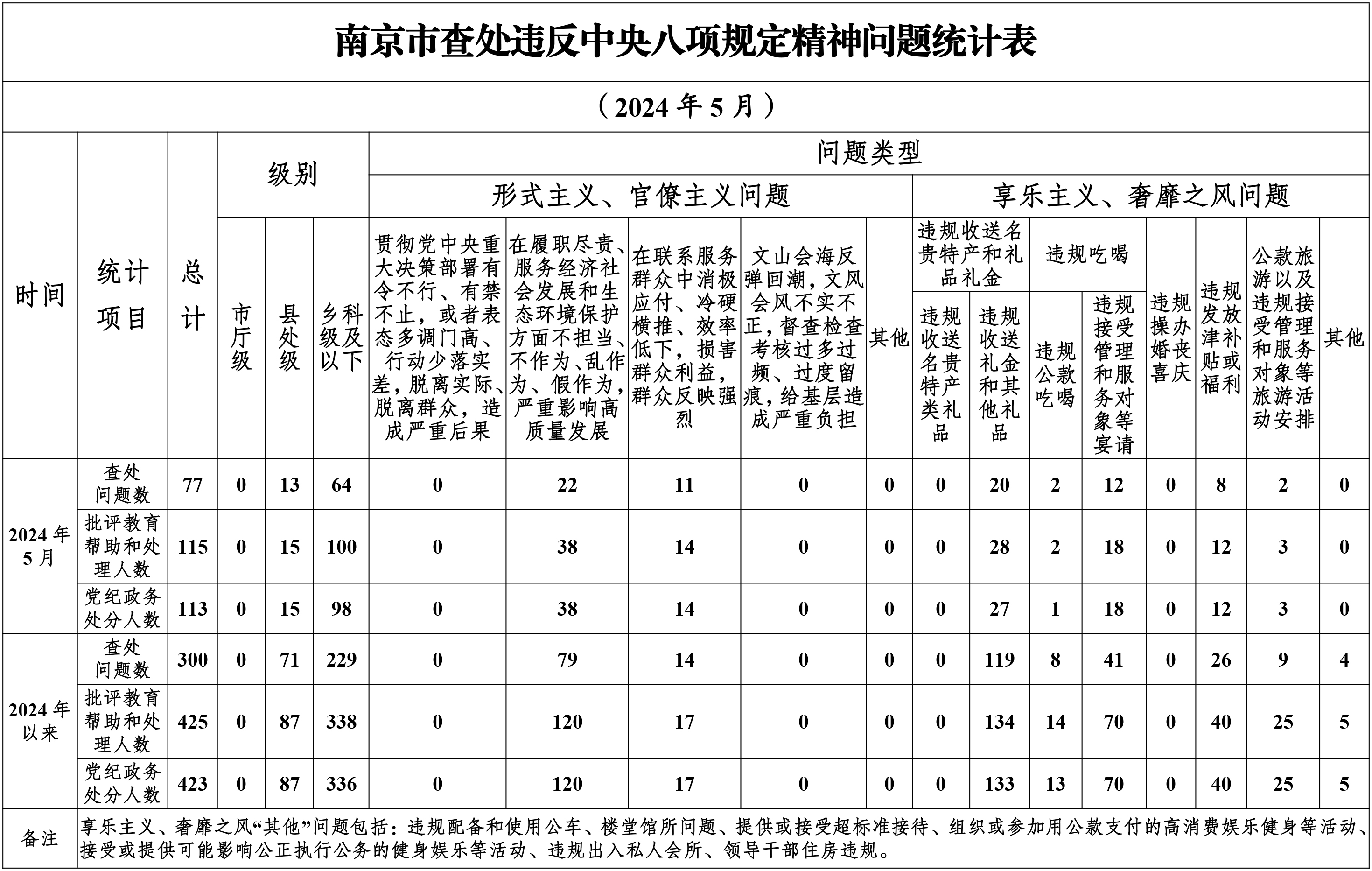 为掌握全市贯彻落实中央八项规定精神情况,南京市纪委监委在各板块、市级机关、市属单位建立了落实中央八项规定精神情况月报制度,定期向社会发布全市查处“四风”问题情况,持续释放落实中央八项规定精神越往后盯得越紧、执纪越严的强烈信号。2024年以来,截至5月31日,全市查处违反中央八项规定精神问题情况如下。