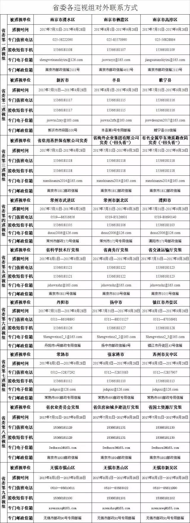 来源:清风扬帆网 更新时间:2017-08-088月2日至3日,江苏省纪委网站公布了十三届江苏省委第二轮巡视进驻南京市溧水区、栖霞区、高淳区、新沂市、丰县、睢宁县、省信用再担保有限公司党委、常州市武进区、新北区、溧阳市、省科学技术厅党组、省商务厅党组、省交通运输厅党组、镇江市丹徒区、扬中市、丹阳市、苏州市吴中区、张家港市、常熟市、省农业委员会党组、省住房和城乡建设厅党组、省国土资源厅党组、无锡市惠山区、锡山区、新吴区等25个地区、单位党组织开展巡视,进驻省海外企业集团有限公司党委、有色金属华东地质勘查局党委开展巡视“回头看”。