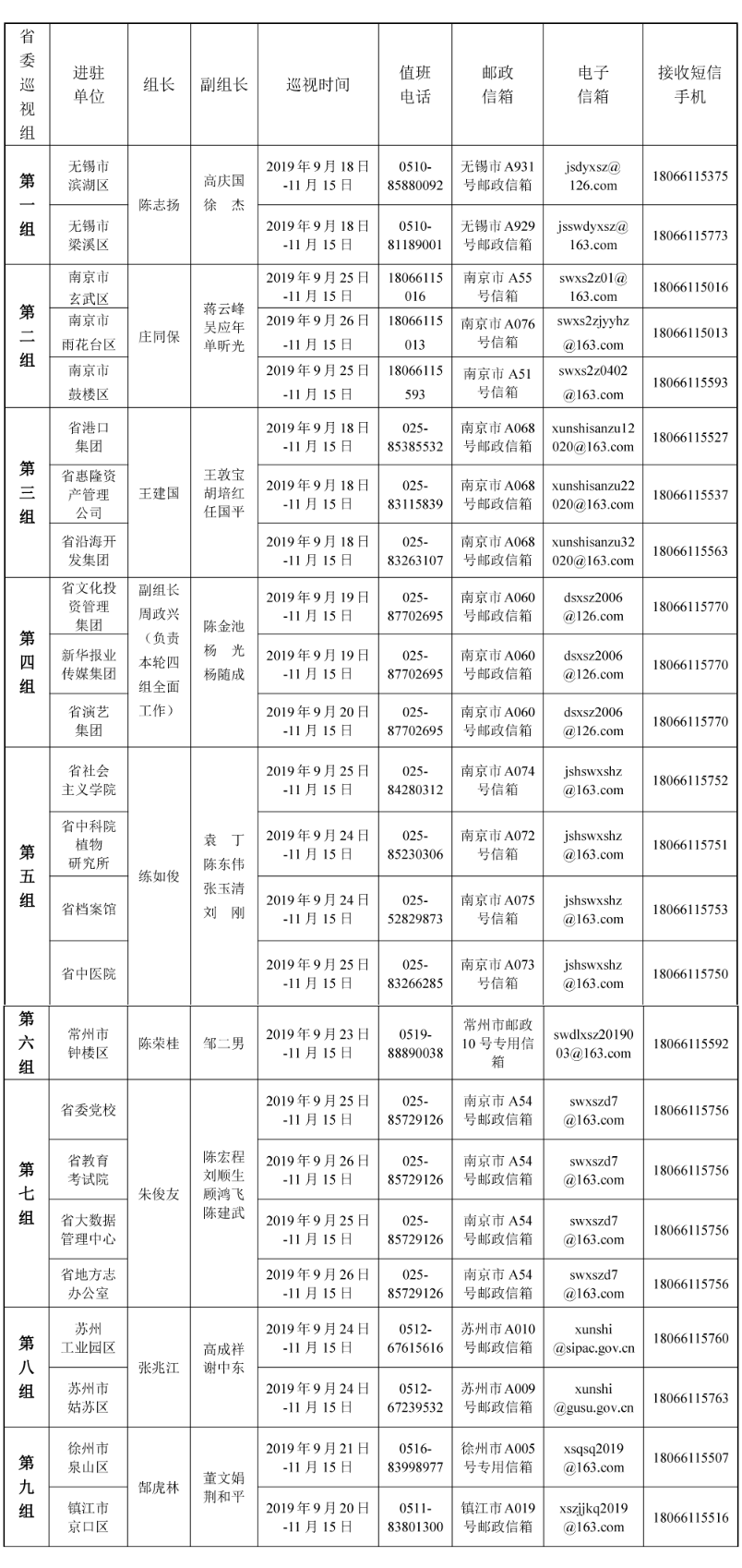 来源:清风扬帆网 更新时间:2019-09-27根据省委安排,十三届江苏省委第七轮巡视对52个地区和单位党组织分两批开展巡视。近日,省委9个巡视组完成第二批对24个党组织进驻。
