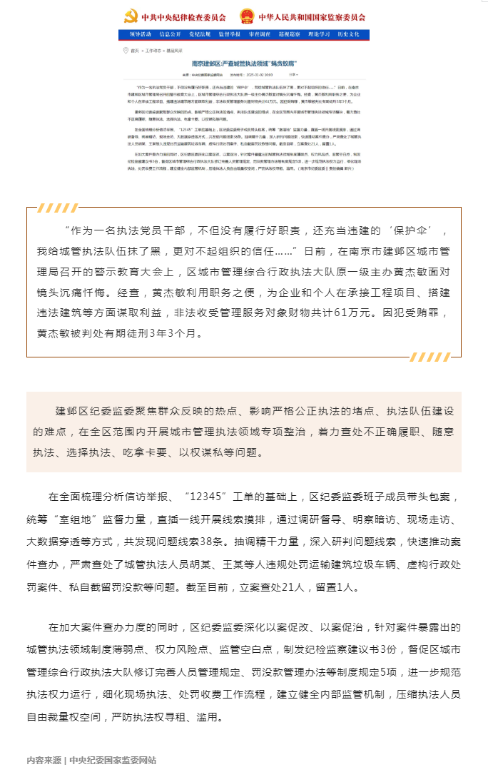 中央纪委国家监委网站刊稿:南京建邺区严查城管执法领域“蝇贪蚁腐”