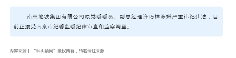 南京地铁集团有限公司原党委委员、副总经理许巧祥接受纪律审查和监察调查