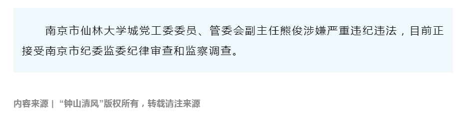 南京市仙林大学城党工委委员、管委会副主任熊俊接受纪律审查和监察调查