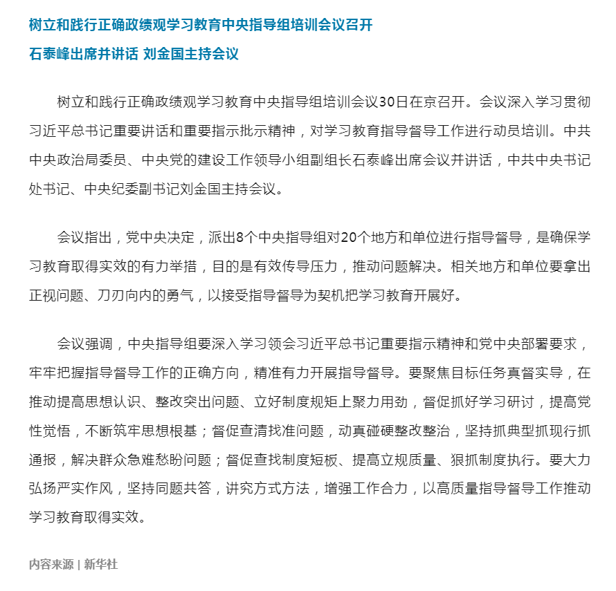 树立和践行正确政绩观学习教育中央指导组培训会议召开