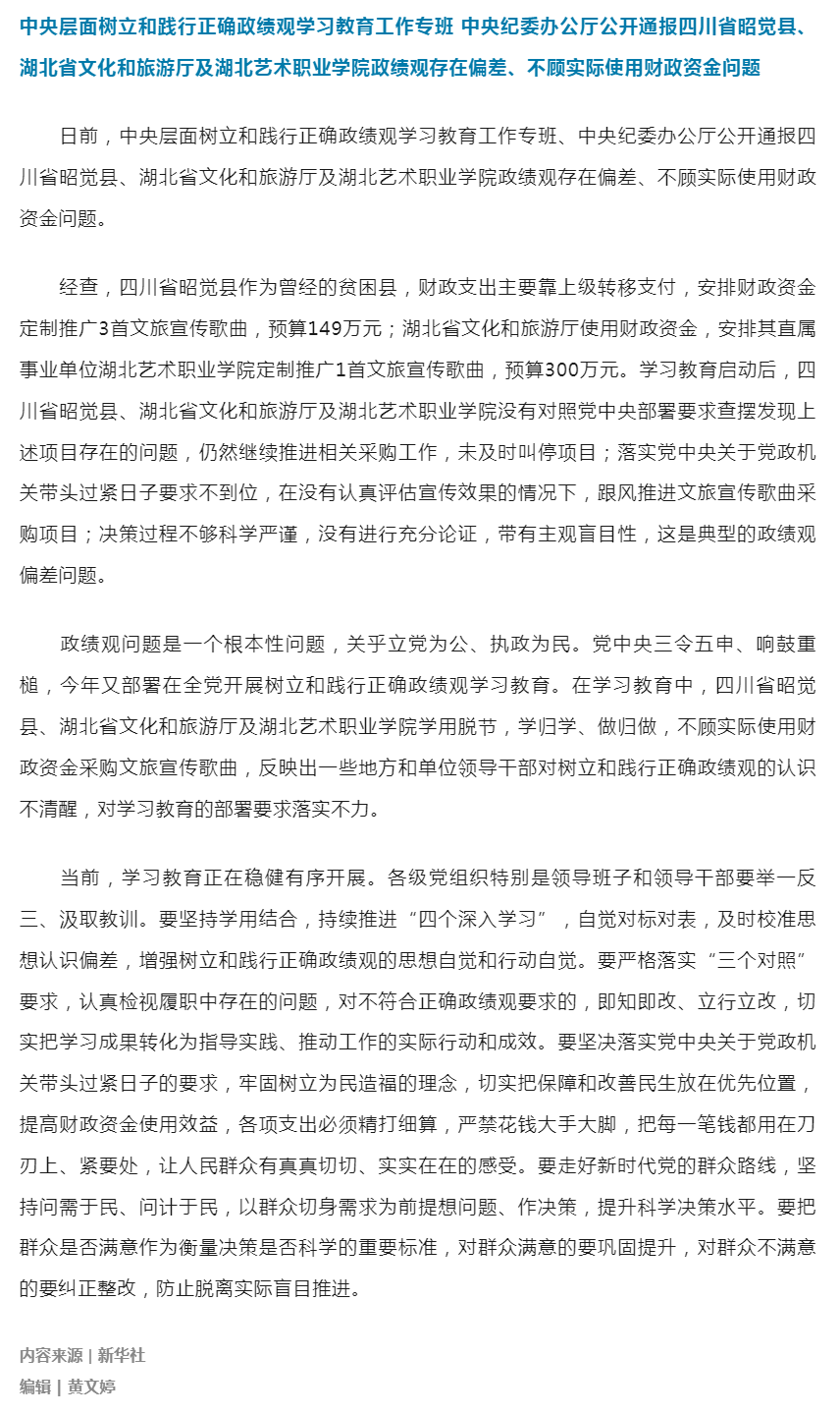 中央层面树立和践行正确政绩观学习教育工作专班 中央纪委办公厅公开通报2起政绩观存在偏差、不顾实际使用财政资金问题